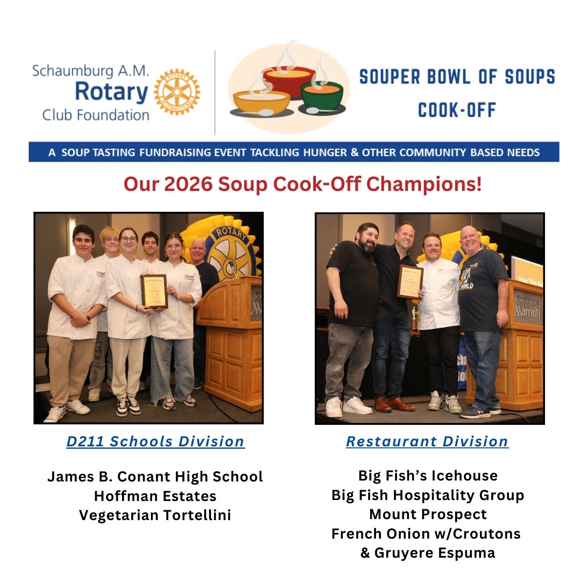 Sample a delicious lineup of soups, cast your vote for your favorite, and help us tackle food insecurity, support children and families in need in addition to other areas of need as determined by Schaumburg A.M. Rotary.